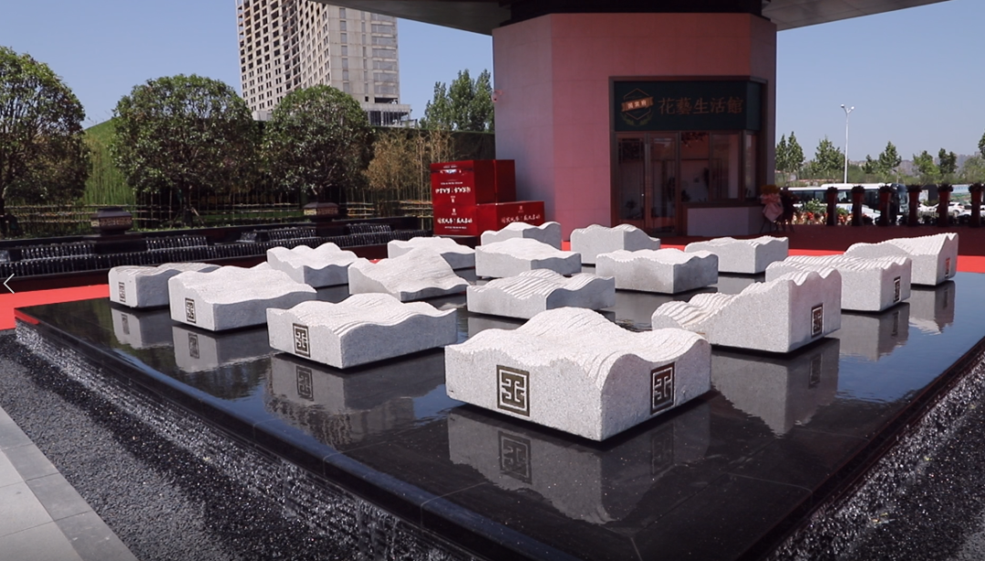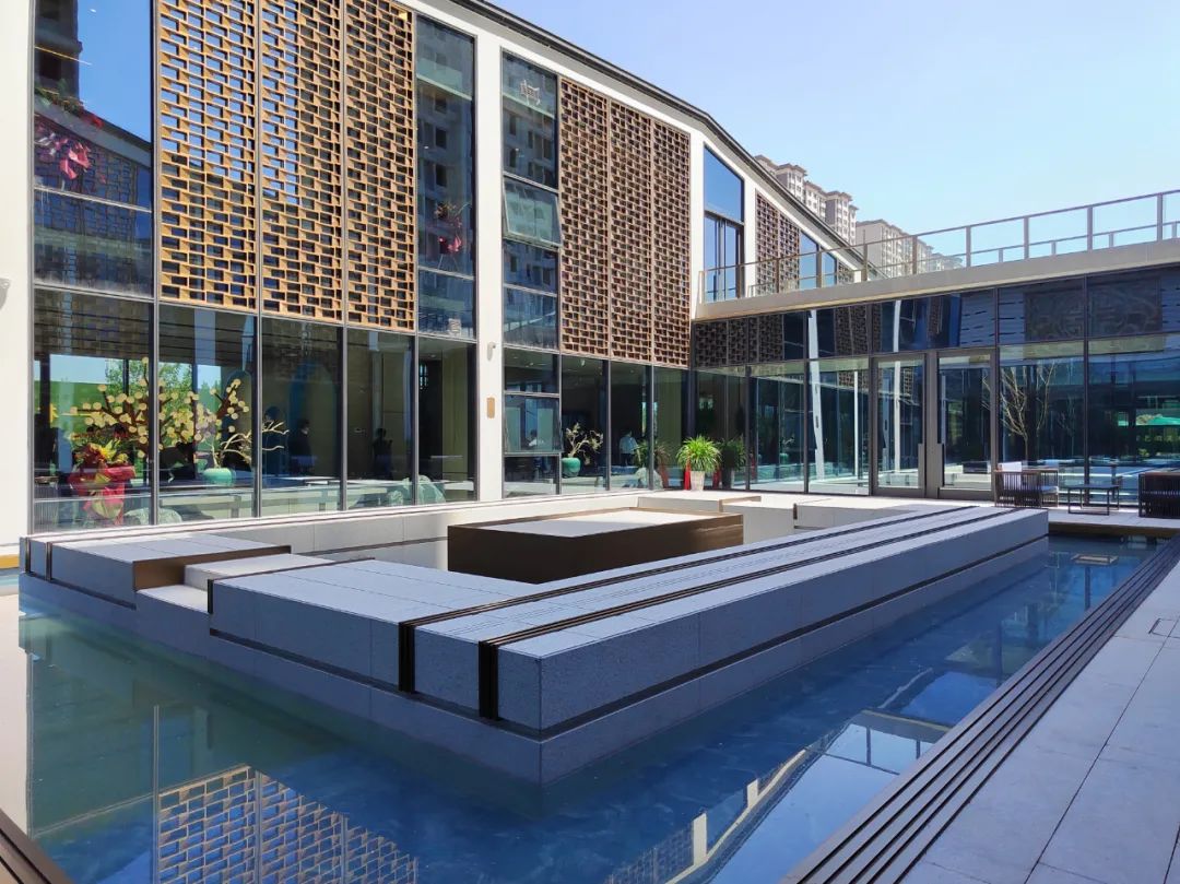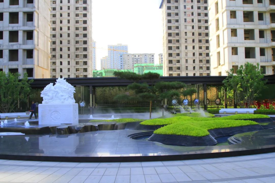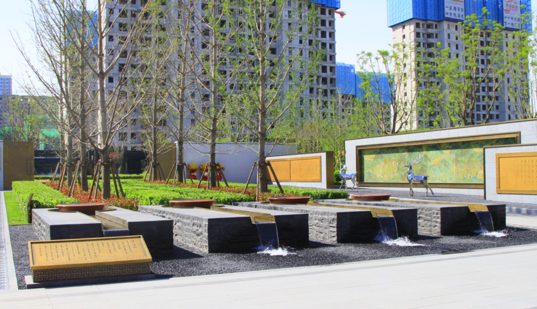 坐落在歷史景觀長軸與和軸的十字交叉點,水景以黑金砂鋪設,呈現出“和”字樣式,池底為景泰藍石材,與周邊不銹鋼流水缽、漢白玉玉璽、造型迎客松等連成一體;從高空俯瞰看,它像是印章一樣印在我們國賓府的中心,寓意國賓府業主家和萬事興。