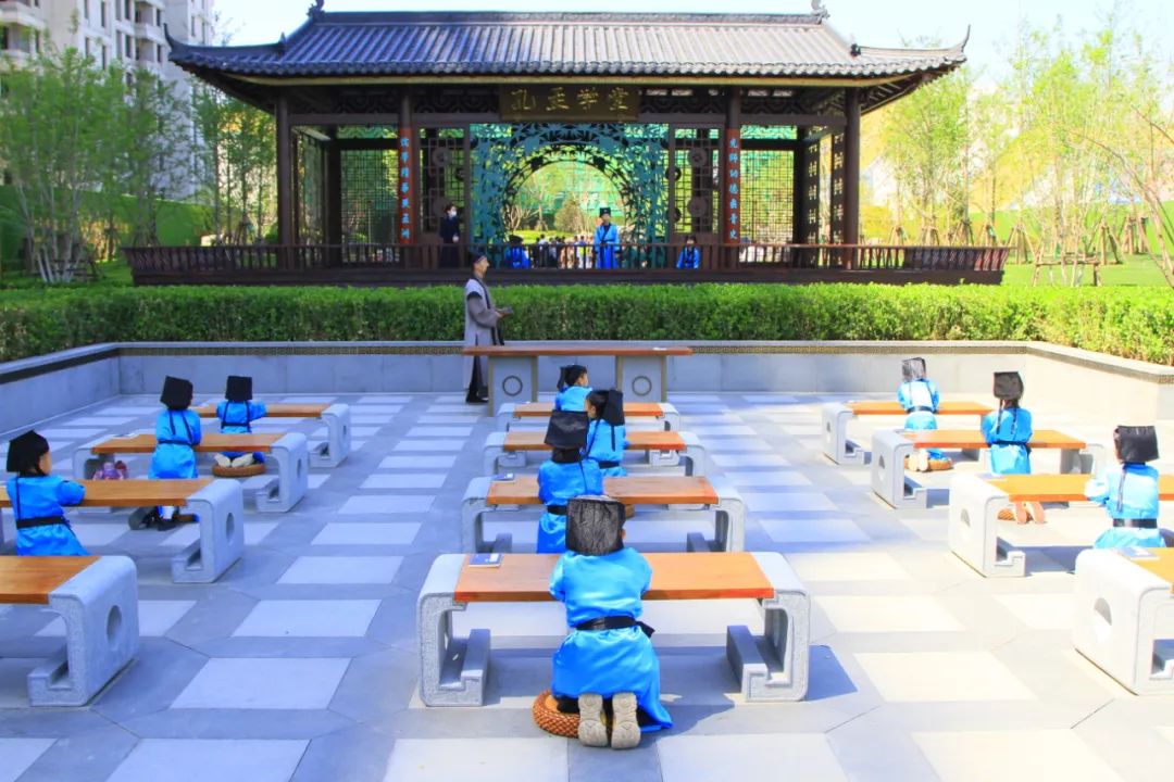 踏入學堂走到書案,映入眼簾是勸學和中庸的書卷雕塑,隔岸可以看到孔孟學堂亭,整個氛圍猶如“孔子講學”的場景。表達了西建國賓府對小業主們長大成龍成鳳的美好愿景。